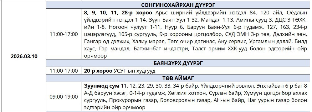 Цахилгааны хязгаарлалт хийж, цахилгаан шугам тоноглолд засвар үйлчилгээ хийх байршлуудын мэдээллийг хүргэж байна. Өнөөдөр (2026.03.10) Сонгинохайрхан, Баянзүрх дүүрэг болон Зуунмод хотод цахилгаан хязгаарлах аж.