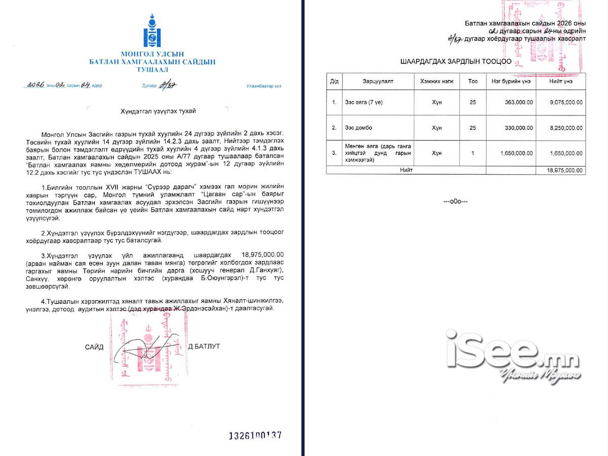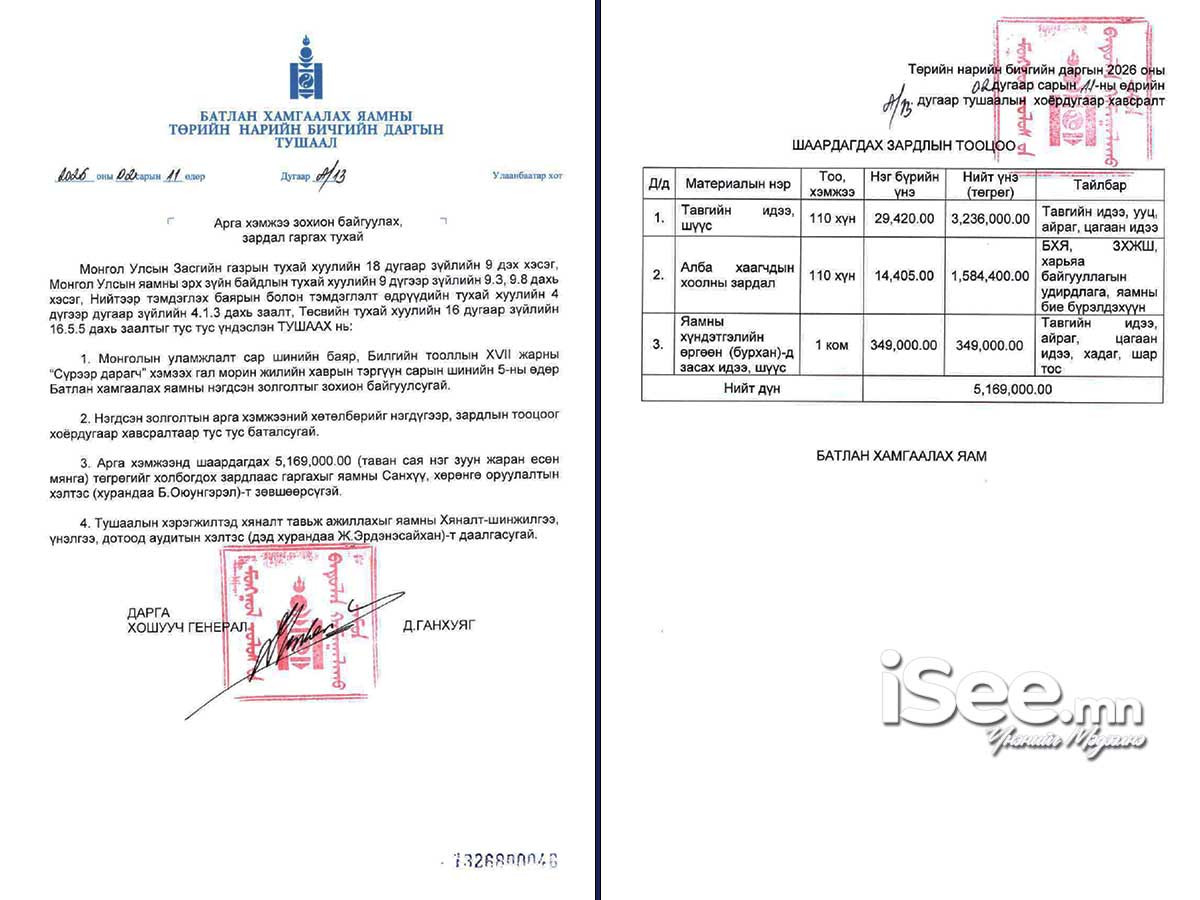 - Алба хаагчдын хоолны зардалд 1 сая 584 мянга