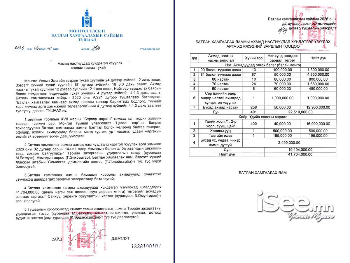 Түүнчлэн Батлан хамгаалах яамны бэлтгэл болон чөлөөнд байгаа генерал, офицер, ахлагч, ахмадуудад хүндэтгэл үзүүлэх арга хэмжээнд 41 сая 740 мянган төгрөгийн санхүүжилтийг гаргасан байна.